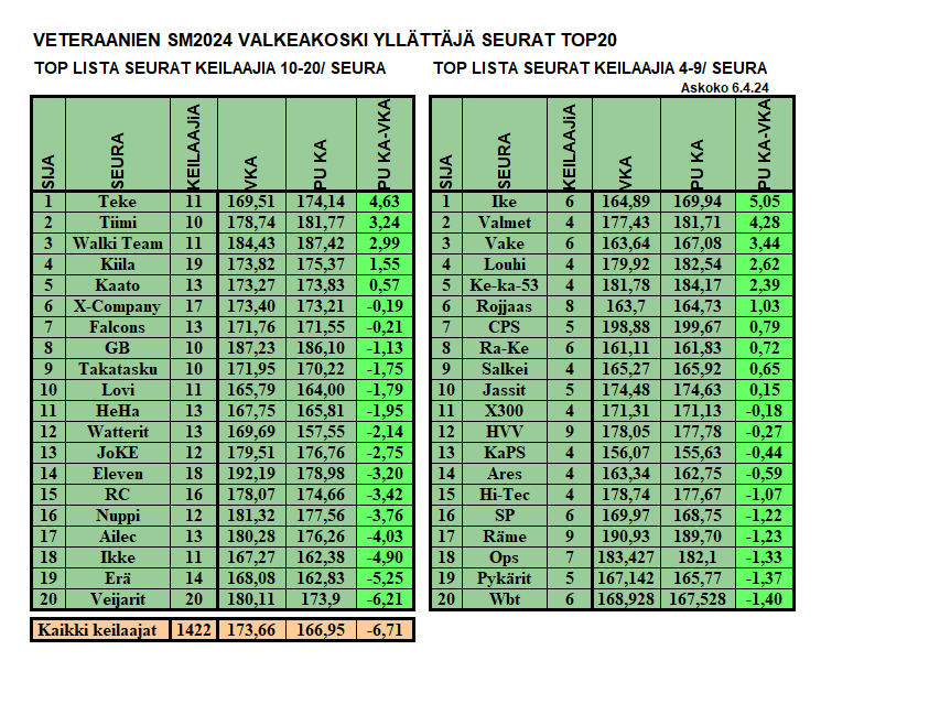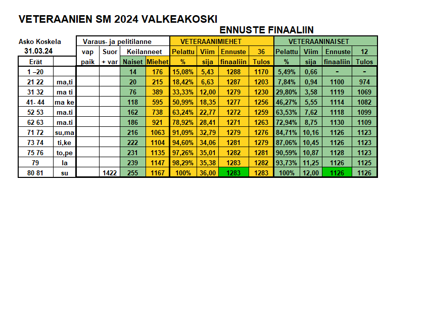 SKL:n miesten finaalin tulosseuranta: https://docs.google.com/spreadsheets/d/16hPNbDb61t7gePjZAOg-qY41_Wn4PeVktwb0_FIVngw/edit?usp=sharing