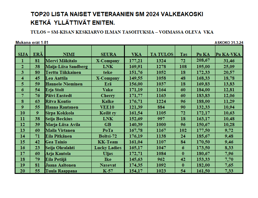 Veteraaninaisten Suomen mestaruuden voitti Ritva Kontio. Toiseksi tuli Maija-Liisa Sandberg ja kolmanneksi Mervi Mäkitalo. Tarkemmin finaalin kulusta voit lukea SKL:n uutisista tästä.