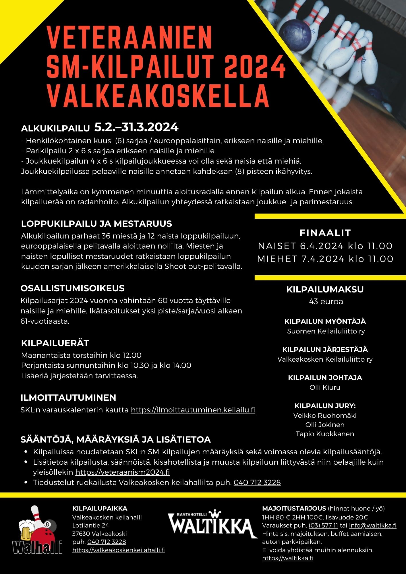 Ilmoittautuminen on avautunut 2.1.2024. Ilmoittautuminen SKL:n sääntöjen mukaisesti osoitteessa: https://ilmoittautuminen.keilailu.fi